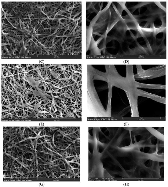 SEM images ((A,B)–only PCL), ((C,D)–PCL + neem oil nanoemulsion), ((E,F)–PCL + lavender oil nanoemulsion), and ((G,H)–PCL + lavender + neem oil). Left column pictures were captured at 1000× maginficaiton, where right column pictures were captured at 5000×. The 5000× images were captured from an arbitrary location. There is clear difference of nanofiber diameter among the samples.was observed from the images.