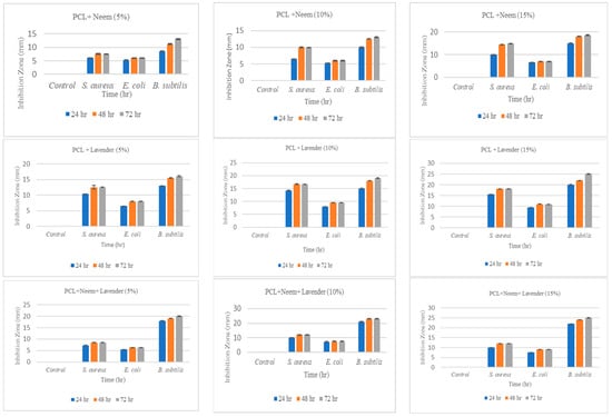 A disk diffusion assay was performed as described above, and the plates were incubated for 24, 48, and 72 h with nanoemulsion controls. The diameter of zones of inhibition was measured at five diagonal points using a caliper. The antimicrobial activity of PCL + neem oil, PCL + lavender oil, and PCL + neem oil + lavender oil at 5%, 10%, and 15% concentrations against E. coli, S. aureus, and B. subtilis is presented in Figure 2. After 24 h of incubation, the diameter of the zone of inhibition (PCL + 5% neem oil) was 8.5 mm for B. subtilis. Figure 2 was created based on a total of 108 sample groups: 4 types (control, 5%, 10%, and 15%) × 3 materials (PCL, PCL + Neem oil, PCL + Neem oil + Lavender oil) × 3 test subjects (Escherichia coli, Bacillus subtilis, and Staphylococcus aureus) × 3 test conditions (24 h, 48 h and 72 h). We prepared three samples per group. That means we have used 324 sample images for the disk diffusion assay. Figure 3 shows a group of sample images captured during the disk diffusion assay.
