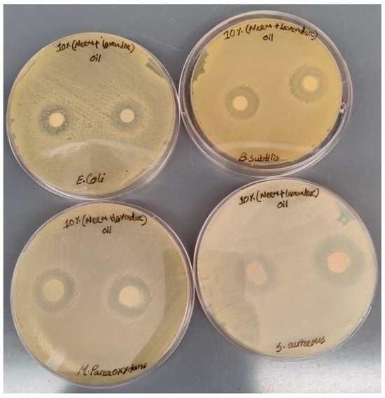 Commercially available neem and lavender oils were purchased from a local market in Edmond, Oklahoma, and stored at room temperature. Sterile deionized water and Tween 80 (polysorbate 80, Sigma Aldrich, St. Louis, MI, USA) were used for all experiments as solvents. ATCC-confirmed strains of Escherichia coli, Bacillus subtilis, and Staphylococcus aureus were provided by the Department of Biology, University of Central Oklahoma, Edmond, Oklahoma. All the bacterial strains were cultured in nutrient broth and plated on nutrient agar media.