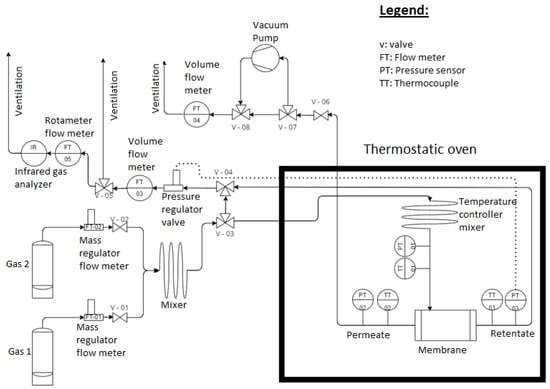 An in-house setup, shown in Figure 1, was designed and developed to carry out the gas permeation experiments. The setup can be operated in “dead-end” mode, where only the permeation flux of pure components is measured, while the retentate side is blocked. This enables pure gas permeance data to be obtained. It can also be operated in a classic mode under steady state, measuring both outlet permeate and retentate streams for the separation of carbon dioxide/methane CO2/CH4 gas mixtures.