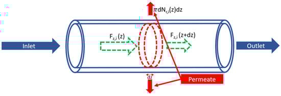 where i represents the specie in the mixture, z is the axial position through the membrane in m, d is the fiber diameter in m, Fz is the local lumen-side molar flowrate in the axial direction in mol s−1, and Nr represents the local permeation flux density (radial) in mol m−2 s−1.