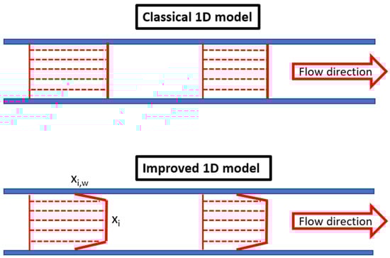 The main purpose of this model is to calculate two different molar fractions for every axial position. The first is the bulk molar fraction, i.e., the mixing-cup molar fraction, and the near-wall molar fraction, which represents the molar fraction at the interface gas separation layer of the membrane as shown in Figure 3. This method, by calculating the near-wall molar fraction, considers the limitation in the gas phase by replacing the bulk partial pressure of Equation (2) by the near-wall molar fraction. For the more permeable species, the driving force is less than that of the classical 1D model, while for the less permeable ones, the driving force is higher.