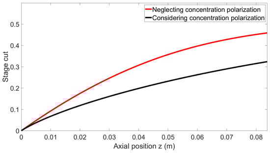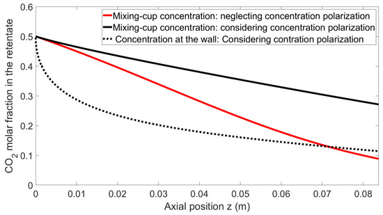 Finally, the molar fraction at the wall is significantly lower than that of the bulk, clearly demonstrating the importance of concentration polarization for these operating conditions.