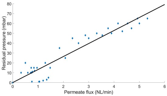 In case of using a vacuum pump on the permeate side of the membrane, a residual pressure should always be taken into account, which corresponds to the pump capacity as a function of the effective transmembrane flux. For the pump, which is experimentally used, the residual permeate pressure is a linear function of the permeation flux as shown in Figure 6.