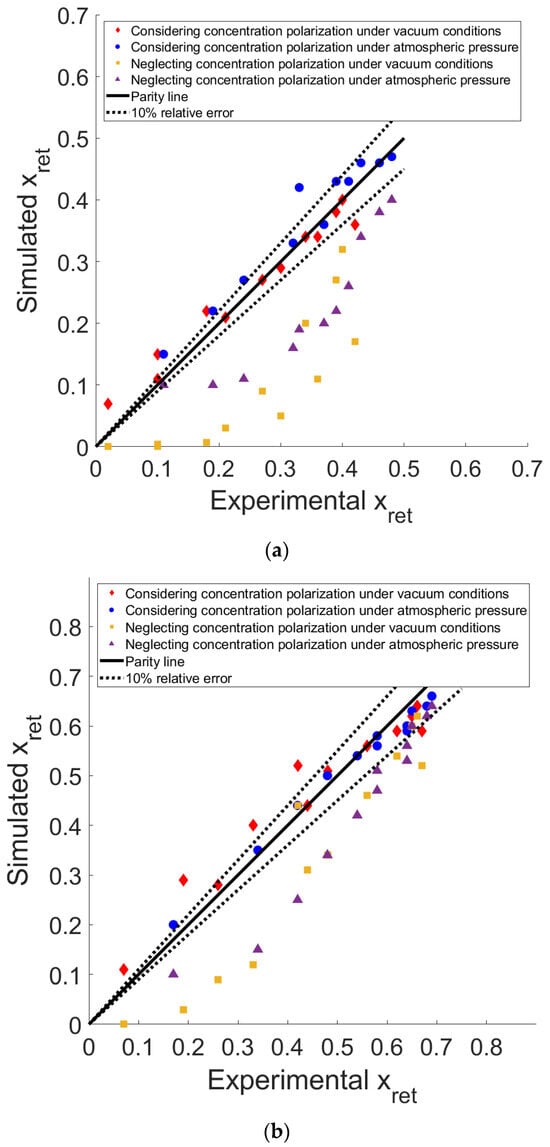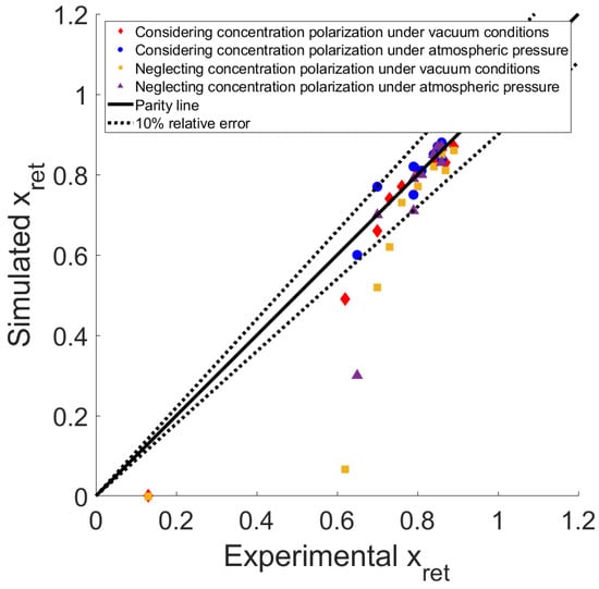 As shown in Figure 7a,b, the numerical predictions of xret (at the outlet of the membrane fiber), the outlet CO2 molar fraction (i.e., at the end of the module), using the improved model that accounts for concentration polarization are within a 10% relative error of the experimental results for most of the operating conditions. The points that correspond to low xret values are the points with the lowest feed flow rates. These low fluxes are difficult to be precisely measured and controlled and have led to the highest relative error ranges. Meanwhile, for the classical model that does not consider this phenomenon, the prediction of the resulting composition is an overestimation in terms of purity, especially for lower xret values at the end of the module, which refers to the lower feed fluxes. At higher feed fluxes, the results of the two models are closer, and this can be explained by the reduction in the residence time in the module; in that case, the change of the composition between the inlet and the outlet of the module is limited because of the higher fluxes (small stage-cut conditions).
