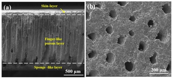 (a) A cross-sectional SEM image of the 3YSZ support; (b) the bottom view SEM image of the 3YSZ support after removing the sponge-like layer.
