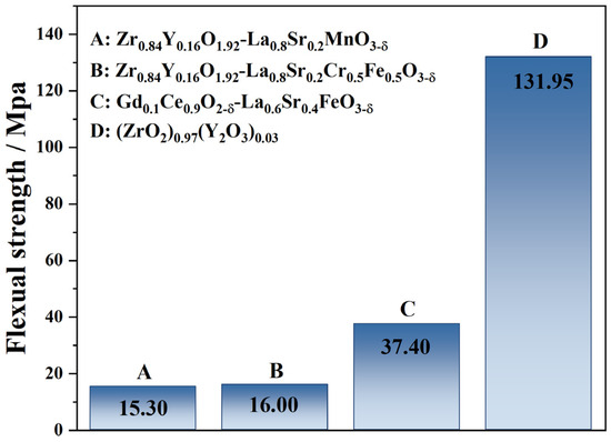 The 3YSZ support obtained by phase inversion tape casting was calcined at 1400 °C for 5 h and then cut into 20 × 30 mm samples for the three-point bending test. Figure 2 compares the bending–breaking strength of the 3YSZ support membrane and other conventional composite cathode membranes. It can be seen that the flexural strength of the 3YSZ support reaches high strength of 131.95 MPa compared with the Zr0.84Y0.16O1.92-La0.8Sr0.2MnO3−δ, Zr0.84Y0.16O1.92-La0.8Sr0.2Cr0.5Fe0.5O3−δ and Gd0.1Ce0.9O3−δ-La0.6Sr0.4FeO3−δ cathode supports [28,29], ensuring the high mechanical strength of the single cells. Previous work has also shown the enhanced mechanical strength of SOFCs using 3YSZ instead of 8YSZ, while maintaining comparable performance [30,31].