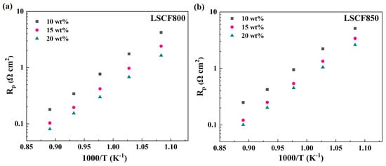 The Rp as a function of temperature at 650–850 °C with different LSCF catalyst loadings treated in air and O2 calcined at (a) 800 °C and (b) 850 °C.