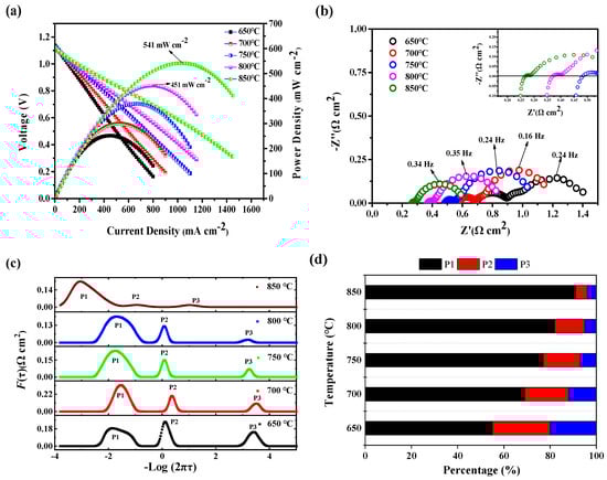 (a) I-V-P curves of the single cell measured at 650–850 °C; (b) the corresponding impedance spectra measured under OCV conditions; (c) DRT analysis of the EIS data measured at 650–850 °C; (d) the proportion of resistance corresponding to the resolution peaks.