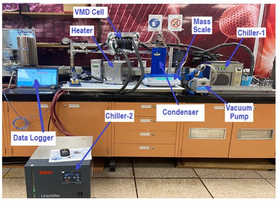 The investigated VMD system was designed and implemented at the King Abdullah Institute for Nanotechnology (KAIN/NAN) in the kingdom of Saudi Arabia (KSA). Figure 1 shows a photograph of the developed system. The VMD setup consists of six major components: a heater, a VMD cell, a vacuum pump, Chiller-1, Chiller-2, and a condenser. The heater was manufactured by Galli company (Milan, Italy), and it consists of a stainless-steel heating tank with a capacity of 4 L, which heats a synthetic salt solution (i.e., saline water) and sends it to the VMD cell via a pump (P1) at state H1, as shown in Figure 2. The hot water flow ranges from 2 L/min to 6 L/min. The feed temperature is controlled by the electrical heater which can regulate the temperature to lie within 40–70 °C. The separation process in the VMD cell depends on the pressure gradient across the hydrophobic membrane. The pressure gradient is generated by applying vacuum pressure to the permeate side. The vapor extracted from the hot side through the membrane transfers to the condenser at state D1. There are two cold water streams that are used in the permeate side and generated using two separate chillers. The first chiller was manufactured by Oasis company (Columbus, OH, USA) and has an input power of 0.16 kW; it is used to condensate the extracted permeate vapor. The second chiller was manufactured by Huber company (Offenburg, Germany) and has an input power of 0.6 kW; it is used only in the hybrid configuration. The purpose of the second chiller is to cool down the permeate side’s temperature in order to reduce its internal pressure. The brine discharged from the VMD cell ends up in a heating tank at state H2. To maintain continuous operation, the reject brine is heated again in the heater and recycled back to the cell. The feed flow rate and temperature are measured by a regulator (ABB) and thermocouple data logger (Pico-TC-08), respectively. The vacuum pressures inside the permeate side are measured by a vacuum pressure gauge. The collected distillate is measured by an A&D Weighing lab balance (Tokyo, Japan) and its salinity is measured by a Delta OHM pH/conductivity meter (Padua, Italy).