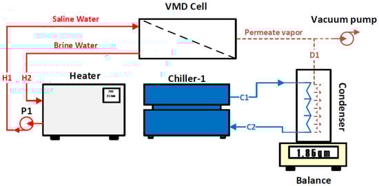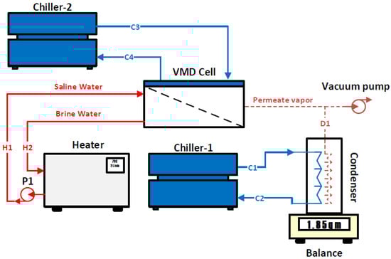 A schematic diagram of the VMD system is shown in Figure 4. The system consists of a VMD cell, a heater, two chillers, a condenser, and pumps (i.e., vacuum pump and hot water pump (P1)). The conservation equations were applied for each component of the VMD system except for the pumps. The following typical assumptions are considered: