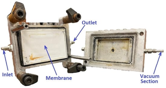 The VMD cell’s outer frame is made of stainless-steel material and equipped with an inlet and outlet for a saline water stream under applied vacuum pressure, as shown in Figure 3. The VMD cell was fastened on a steel structure and placed in the center of the VMD system. The VMD cell is thermally insulated to minimize heat losses to the surrounding environment. The characteristics and specifications of the commercial membrane used in this work are listed in Table 1.