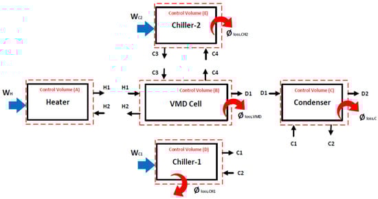 Conservation equations were applied to each component of the VMD system using control volumes in order to predict the unmeasured variables such as heat loss and work performed on some components. These control volumes are shown in Figure 5. The outcome of the conservation equations help in estimating the performance indicators to be used in evaluating the VMD system [,].