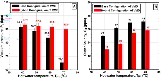 In this section, we illustrate the effect of feed flow rate and feed temperature on the behavior of both the base and hybrid configurations. Figure 6 shows the variation in process variables such as the vacuum pressure and outlet salinity of the distillate water over a range of hot water temperatures. Increasing the hot water temperature led to a significant decrease in the vacuum pressure for the two configurations but at different rates, which complies with the vacuum pressure behaviors reported in previous works [,]. It was evident that the hybrid configuration approximately maintained the vacuum pressure at high values over the entire range of tested temperatures with an average value of 92 kPa. Moreover, the maximum enhancement percentage of the vacuum pressure was registered at the highest hot feed temperature (TH1~70 °C) which reaches 38% over the base configuration, as shown in Figure 6A. In addition, the maximum reduction percentage of the outlet salinity compared to that of the base configuration can reach up to 40% at the lowest operating temperature, as shown in Figure 6B. Of course, the reduction in product salinity is the outcome of maintaining high vacuum pressure.