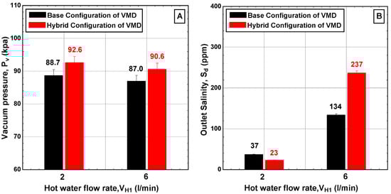Effect of the hot water flow rate VH1 on (A) vacuum pressure into the VMD cell and (B) outlet salinity of produced water for different configurations ( = 50 °C, = 65,000 ppm, = 2 L/min, = 8.9–10.3 °C, = 4.5 L/min, and = 12.9 °C).