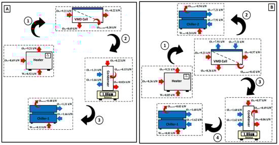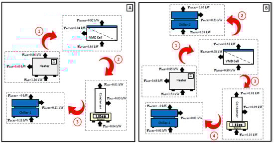 Exergy diagram of the VMD system: (A) base configuration and (B) hybrid configuration.