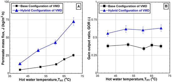Effect of the hot water temperature TH1 on (A) permeate mass flux and (B) gain output ratio for different configurations ( = 2 L/min, = 65,000 ppm, = 2 L/min, = 8.6–11.4 °C, = 4.5 L/min, and = 10.7–23.1 °C).