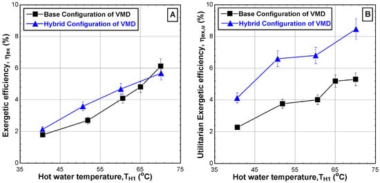 Effect of the hot water temperature TH1 on (A) exergetic efficiency and (B) utilitarian exergetic efficiency for different configurations ( = 2 L/min, = 65,000 ppm, = 2 L/min, = 9.1–11.2 °C, = 4.5 L/min, and = 10.7–23.1 °C).