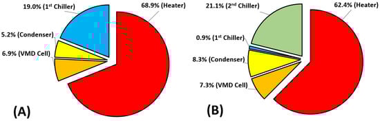 Exergy destruction percentage of the main components of the VMD system: (A) base configuration and (B) hybrid configuration ( = 2 L/min, = ~70 °C = 65,000 ppm, = 2 L/min, = 9.1–11.2 °C, = 4.5 L/min, and = 23.1 °C).