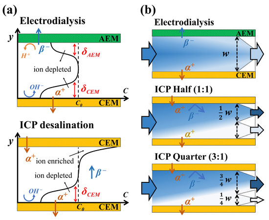 In electrodialysis, the AEM and CEM are alternately arranged, resulting in a single desalted channel as negative and positive ions exit through the AEM and CEM, respectively [11,12,25] (See Figure 1a). In ICP desalination, only CEMs (or AEMs) are arranged, resulting in respective ion depletion and enrichment zones on the bottom and the top, which produce desalted and enriched output flow via bifurcated downstream channel [21,22,23]. ICP desalination shows better desalting performance (i.e., more salt removal) than electrodialysis due to thicker ion depletion zone on the CEM when NaCl feed used [21,22]. Furthermore, beyond limiting current density (i.e., the overlimiting regime), ICP desalination utilizing only CEMs also exhibits better desalination since increased catalytic activity of fixed charged groups in AEM degrades active electroconvection and ion transfer [26,27,28]. Given that we aim to remove salt ions as much as possible in low-concentration desalination, it is not suitable to keep the ICP strategy with evenly bifurcated channels only. Instead, we added another type that reduces the recovery of the desalted water by half (i.e., recovery of 0.25) to extract much depleted output flow. As shown in Figure 1b, ion-enriched and -depleted output channels are divided in a ratio of 3:1 in ICP Quarter (ICPQ), while two output channels are evenly divided in ICP Half (ICPH), keeping the intermembrane distance (w).