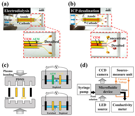 Photographs of PDMS-based microfluidic (a) electrodialysis and (b) ICP devices. Each device has two ion exchange membranes (AEM and CEM for electrodialysis and two CEMs for ICP desalination) and two carbon-based electrodes. (c) Schematics of the assembly of the microfluidic device. It was fabricated by mounting two carbon electrodes and two membranes, and subsequent plasma bonding to the upper and bottom PDMS blocks. (d) Experimental setup of the microfluidic electromembrane system for fluorescent visualization and the measurement of desalination.