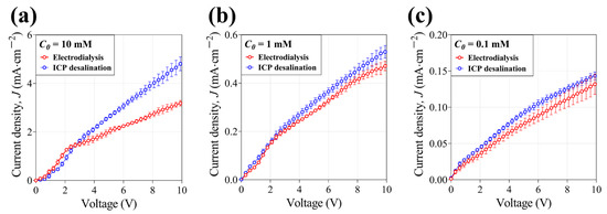 Current density–voltage (I–V) curves with (a) 10 mM, (b) 1 mM, and (c) 0.1 mM NaCl feed in electrodialysis and ICP desalination.