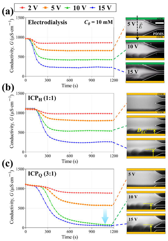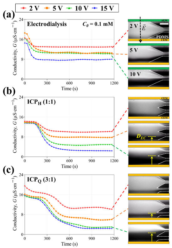 Conductivity changes in the desalted flow from 2 V to 15 V in (a) electrodialysis, (b) ICPH, and (c) ICPQ. Corresponding fluorescent images are shown on the right; 10 mM NaCl feed was used in all experiments; and the scale bar indicates 1 mm.