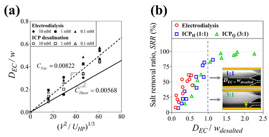 (a) Dimensionless thickness of the electroconvection zone (DEC/w) plotted against the scaling factor ((V2/UHP)1/3) at various applied voltages and feed concentrations in electrodialysis and ICP desalination. The black line and the dotted line indicate the scaling law by the theory and experiments, respectively. (b) The salt removal ratio depending on the electroconvection zone (DEC/wdesalted).