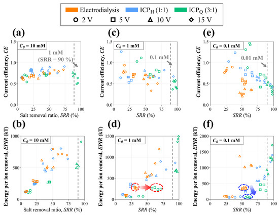 To examine desalination efficiency, CE and EPIR depending on the SRR are calculated based on the experimental data of all the types in Figure 7. In the case of NaCl 10 mM, CE (See Figure 7a) is at a similar level for all types, but ICPQ shows lower CE at high voltage (10 V and 15 V). It is mainly because ion ion-depleted stream includes an enriched outlet where it achieves a much higher SRR (~90%) than the other types. Looking at the EPIR plot (See Figure 7b), ICPQ exhibits lower EPIR until 90% of the SRR but shows a significant increase in EPIR at a high applied voltage (15 V) and SRR (>90%). As the feed concentration decreases (NaCl 1 mM and 0.1 mM), ICP types achieve a high SRR at a relatively low applied voltage, while electrodialysis cannot reach those high SRRs even though a high voltage is applied (See Figure 7c–f). Hence, ICP desalination can be confirmed in applications that require a high SRR in low-concentration feed. In particular, ICPQ shows ab SRR that is more than twice as high compared with that of electrodialysis at the same applied voltage (see the red circles in Figure 7d) and EPIR is less than half as low compared with electrodialysis at the same SRR (see the blue circles in Figure 7f). Even so, it has to be mentioned that EPIR can dramatically increase when desalted streams pass over the width of the desalted outlet (i.e., SRR > 99%). Therefore, utilizing single-step recovery-reduced ICP desalination, one can realize much a higher SRR with less EPIR by optimizing outlet recovery and operating parameters for various feed concentrations.
