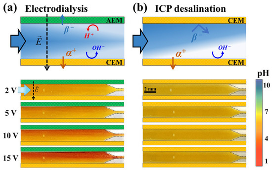 One of the significant differences between electrodialysis and the ICP strategy is the presence or absence of an AEM. It is known that water splitting occurs more actively on the AEM surface since the catalytic activity of the fixed charge group in an AEM is greater than that of the fixed charge group in a CEM [26,27,28]. The generated H+ and OH− interfere with the development of electroconvective vortices, thus hindering ion transfer. To confirm the phenomena more clearly, we visualized a pH shift in the flow in the electrodialysis and ICP devices using a pH indicator. As shown in Figure 8, the pH shift in electrodialysis occurs around 6–7 through the whole channel, whereas in ICP, it occurs around 0–1 near the ion depletion zone at the same applied voltage. In other words, electrodialysis has a significant loss due to water splitting rather than ion transfer in low-concentration desalination. This agrees with the experimental results that electrodialysis has a lower SRR and CE and a higher EPIR than ICP desalination.