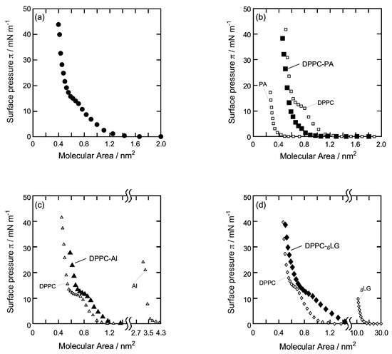 As shown in Figure 2a, π of pure DPPC increased gradually from ca. 1.2 nm2 molecular area, and after an unclear and plateau range at around π = 14 mN/m, increased up to π = 44 mN/m. The plateau range corresponds to the two-dimensional phase transition from a liquid-expanded (LE) to a liquid-condensed (LC) state. The limiting molecular area A0 was 0.59 nm2/molecule (ca. 40 mN/m) and 23% larger than that obtained by the compression method (0.48 nm2/molecule) [32,47]. The present curve was in close agreement with those we have reported previously [37], indicating that the DPPC monolayer is in a semi-expanded state and has a flexible and fluid structure. The dropping method allows the hydrophilic group of DPPC molecules and water molecules to make a structure that maintains the most comfortable hydrogen-bonding network due to the hydrophilic interaction, including the flexibility of two alkyl chains in DPPC molecules [16,37].