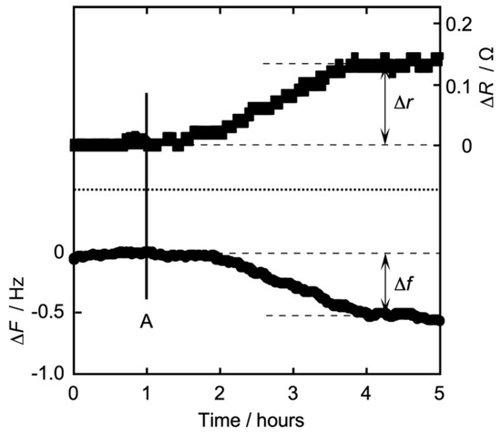 Figure 4a,b show an Iso concentration-dependent behavior of Δf (QCM, Figure 4a) and Δr (QCI, Figure 4b) for QCO in contact with a DPPC monolayer (π = 35 mN/m) at 26 °C. The horizontal axis represents an Iso concentration (bulk subphase), and the vertical axis represents Δf in Figure 4a and Δr in Figure 4b. Δf also shows the absolute value (positive value) as an amount of change from the baseline (ΔF) before the addition of Iso.