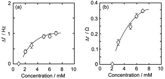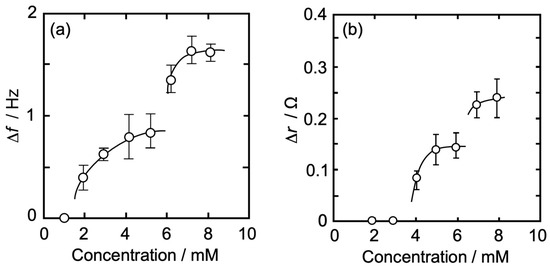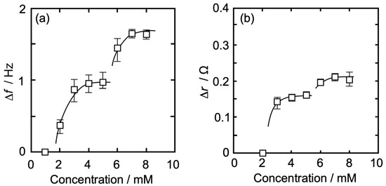 In Figure 4b, there was no change in Δr at an Iso concentration of ≤3 mM, whereas it gradually increased with the increase in the concentration at >3 mM and approached asymptotically to a first saturation value of 0.14 Ω at around 6 mM. The concentration at which the change in Δr started (4 mM) was higher than that of Δf (2 mM). At >6 mM, Δr started increasing again and approached asymptotically to a second saturation value of 0.25 Ω. The amount of Δr change at each Iso concentration is shown in Table 1. The first curve shape of the concentration dependence and each Δr value (Table 1) in Figure 4b was similar to our previous report on the independent QCI measurement using 6 MHz QCO [58], whereas the second ones were a little different; each Δr value was larger and showed an asymptotic curve. The thickness of 5 MHz QCO is 1.2 times larger than that of 6 MHz QCO. This thickness effect may make possible a stable oscillation of QCO and a sensitive change in resistance in QCO at a concentration of >6 mM.