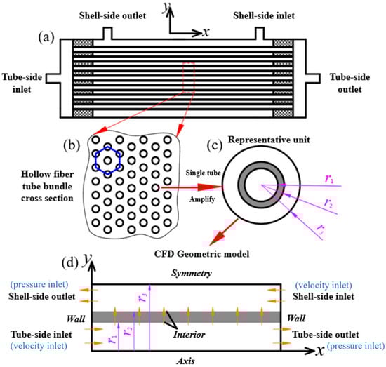 CFD geometric model for mass transfer study in hollow fiber membrane module (a) Hollow fiber membrane module; (b) hollow fiber tube bumdle cross section; (c) single tube; (d) two-dimensional axisymmetric model.