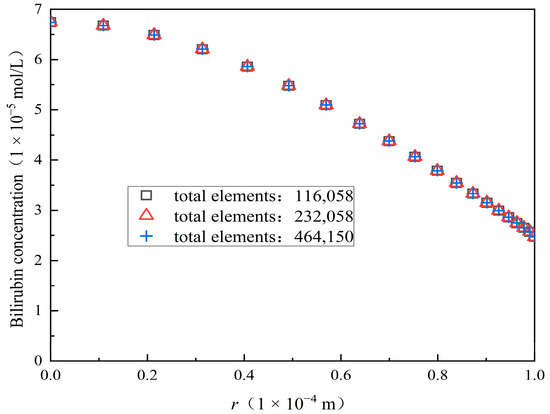 For mesh independence verification, three different numbers of total mesh elements, i.e., 116,058, 232,058, and 464,150, are used for the simulations. Figure 4 shows the bilirubin concentration distributions along the radial direction for the three different total mesh elements and Table 3 gives the maximum concentration at the tube-side outlet and relative errors between two different total mesh elements. As we can see from Figure 4 and Table 3, the differences of bilirubin concentration among the three different total mesh elements are very small, and the maximum concentration tends to a constant value with the increase of mesh elements. The relative error between the calculation results of 116,058 and 232,058 is 0.008007%, and the relative error between the calculation results of 232,058 and 464,150 is 0.004152%. It can be seen that the simulation results are independent of these three different total mesh elements. In order to reduce the computational time, we used 232,058 total mesh elements for the simulation of the mass transfer behavior in the hollow fiber membrane module.