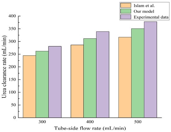 - The urea clearance rate obtained by our numerical model agrees well with the experimental data and the numerical simulation results. When the tube-side flow rate is 300 mL/min, 400 mL/min, and 500 mL/min, the relative errors between our simulation results and the experimental data are 6.77%, 8.13%, and 7.27%, respectively.