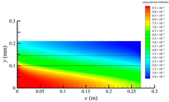 Figure 6 shows the bilirubin concentration distribution in the hollow fiber membrane module. As seen in Figure 6, the bilirubin enters at the tube-side inlet, but the bilirubin was found both in the membrane region and in the shell-side region. It means that bilirubin transport from the tube-side to the shell-side has occurred. The bilirubin concentration decreases with increasing axial or radial distance, and the decrease in the radial direction is much faster than that in the axial direction. This is due to the fact that the membrane acts as a barrier to the solute, which can reduce the bilirubin transport through the membrane. From the bilirubin concentration distribution shown in Figure 6, it can also be observed that the bilirubin transport from the tube-side to the shell-side has mainly occurred in the regions near the tube-side inlet, indicating that the removal of bilirubin primarily takes place near the tube-side inlet.
