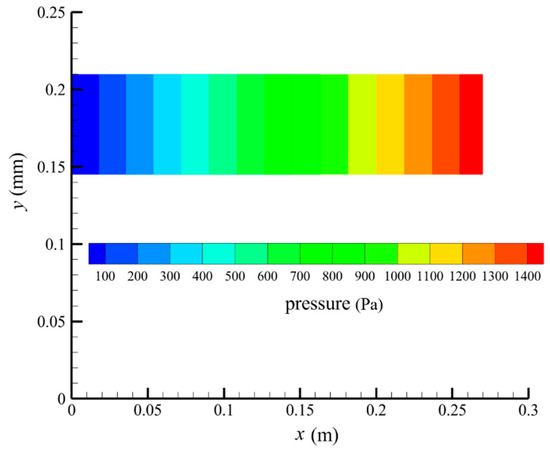 Figure 9 displays the pressure distribution along the axis and the symmetry, and the left side of the intersection of the two pressure profiles is the positive TMP region and the right side is the negative TMP region. It can be seen that the pressure distribution along the axial and the symmetry is almost linear. Hence, according to Equation (23), TMP distribution is also almost linear. Consequently, the convective transmembrane flux exhibits a linear distribution, as described in Equation (9). This result is consistent with the findings of Magalhaes et al. [35]. As shown in Figure 9, at x ≈ 0~0.175 m, the pressure in the tube-side region is higher than that in the shell-side region. The positive TMP drives the bilirubin to transfer from the tube-side region through the fiber membrane to the shell-side region. Due to this positive TMP, the bilirubin convective transport has mainly occurred in the regions near the tube-side inlet, which is consistent with the bilirubin concentration distribution shown in Figure 6. At x ≈ 0.175~0.27 m near the inlet of the shell-side region, the negative TMP drives the fluid or solute to transfer from the shell-side region through the fiber membrane to the tube-side region. Therefore, at x ≈ 0.175~0.27 m, the bilirubin molecule cannot transfer from the tube-side region to the shell-side region via convective mass transfer. However, as can be observed in Figure 6, bilirubin molecules still exist in the membrane region and the shell-side region at x ≈ 0.175~0.27 m, indicating that the bilirubin can also be transferred from the tube-side region to the shell-side region via diffusive mass transfer.