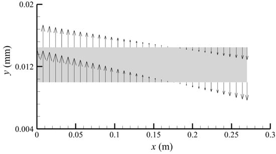 Figure 10 displays the velocity vector distribution at the interfaces of the fiber membrane. As can be seen in Figure 10, it is obvious that mass transfer has mainly occurred in the regions near the tube-side or shell-side inlet. This is attributed to the larger TMP near the tube-side or shell-side inlet. The velocity vector distribution is consistent with the bilirubin concentration distribution shown in Figure 6 and the pressure distribution shown in Figure 9.