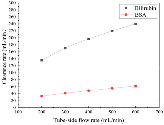 The bilirubin and BSA clearance rates for varying tube-side flow rates: 200, 300, 400, 500, and 600 .