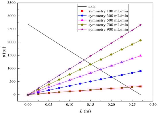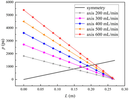 The pressure distributions along the axis and the symmetry for varying shell-side flow rates.