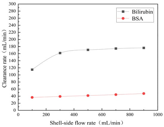 Figure 13 shows the bilirubin and BSA clearance rates for varying shell-side flow rates (i.e., 100, 300, 500, 700, and 900 ) with the tube-side flow rate 300 . Table 6 shows the bilirubin and BSA concentration distributions for varying shell-side flow rates. It can be observed in Table 6 that the concentration at the tube-side outlet and in the tube-side region decreases with the increase in the shell-side flow rate, indicating that the clearance efficiency of the solute improves. As shown in Figure 13, with the increase in the shell-side flow rate, the bilirubin clearance rate exhibits a rapid increase from 114.93 to 170.79 mL/min when the shell-side flow rate is less than 300 and then a slow increase from 170.79 to 176.34 mL/min, while the BSA clearance rate increases slowly from 36.46 to 47.46 mL/min.