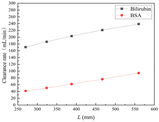 Figure 15 shows the bilirubin and BSA clearance rates for varying fiber tube lengths (i.e., 270, 324, 388.8, 466.56, and 559.872 mm) with the tube-side flow rate 300 and the shell-side flow rate 500 . The fiber tube length is increasing proportionally with the ratio 1.2. Table 7 shows the bilirubin and BSA concentration distributions for varying fiber tube lengths. It can be seen from Figure 15 that with the increase in the fiber tube length, the bilirubin clearance rate increases from 170.79 to 238.786 mL/min, while the BSA clearance rate increases from 41.67 to 94.36 mL/min. Clearance rates of both bilirubin and BSA have been obviously increased, which is consistent with the bilirubin and BSA concentration distributions in Table 7.