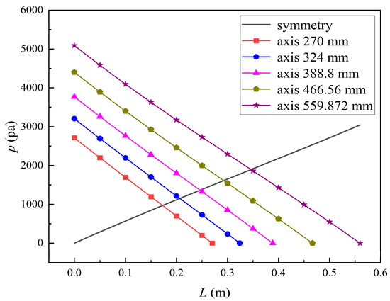 The pressure distributions along the axis and the symmetry for varying fiber tube lengths.