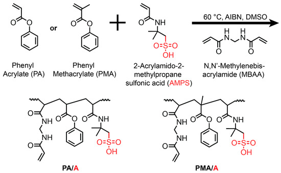 Phenyl methacrylate (PMA, >97%) and N,N’-methylenebisacrylamide (MBAA, >98%) were purchased from TCI (Tokyo, Japan). Phenyl acrylate (PA, 97%) was purchased from Ambeed, Inc. (Arlington Heights, IL, USA). Acrylamido-2-methyl-1-propanesulfonic acid (AMPS, 99%), ammonium chloride (NH4Cl), and 2,2′-azobis(2-methylpropionitrile) (AIBN, 98%) were purchased from Sigma-Aldrich Chemicals (St. Louis, MO, USA). Dimethyl sulfoxide (DMSO, ≥99%) was purchased from Macron Fine Chemicals (Radnor, PA, USA). All chemicals were used as received. High-purity nitrogen was purchased from Airgas. Type-1 deionized water (DI water) was produced by a Waterpro BT Purification System from Labconco (18.2 mΩ∙cm at 25 °C, 1.2 ppb of TOC). Nafion® 117 was purchased from Chemours (Wilmington, DE, USA).