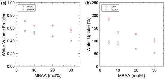 The water volume fractions and water uptakes of the eight dissimilar membranes are shown in Figure 2. The water volume fraction decreases with increasing MBAA content, which is attributed to the reduced free volume in the more densely crosslinked network. Furthermore, the PA-containing films have distinctly higher water volume fractions than the PMA-containing films. This is primarily attributed to the methyl group being both hydrophobic and much larger than the single hydrogen on PA. The measured water uptake closely mirrors the behavior of the water volume fractions, with higher water uptake for PA-containing membranes over PMA-containing membranes with decreasing water uptake with increasing MBAA content.