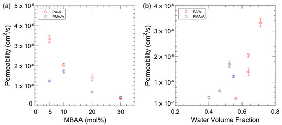 Ammonium permeabilities of PA/A (red) and PMA/A (blue) against MBAA content (a) and water volume fraction (b).