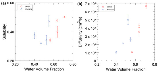 The solution–diffusion model (Equation (5)) says that the permeability of a species is a product of its solubility and its diffusivity. Here, we measured the solubility of ammonium in these membranes, and the diffusivity calculated based on the solution–diffusion model (Figure 4). For the solubility, there is a general positive dependence of the solubility on water volume fraction, especially for the PA/A membranes. However, we also note that the two membranes with 10 and 20% MBAA that exhibited similar water volume fractions showed dissimilar solubilities, which we attribute to the impact of MBAA itself in lieu of the differences in the crosslinked network. The film solubility to ammonia increasing with decreasing MBAA content can be explained by the higher AMPS concentration which results from this change. The sulfonated groups in AMPS increase the film solubility to charged solutes like ammonium since sulfonic acids are strong electrolytes. The PA/A films generally had higher ammonium solubilities at equivalent MBAA content, except the 30 mol% MBAA compositions.