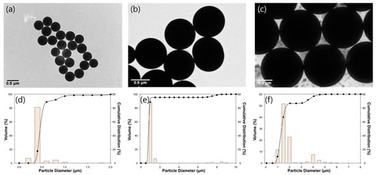 TEM images and graphs of particle size distribution of SNPs measured using PSA: (a,d) 400 nm, (b,e) 900 nm, and (c,f) 1300 nm.