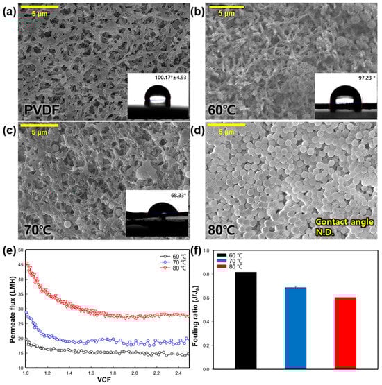 Effect of feed temperature on silica particulate membrane fouling; SEM images (5000×) and water CA value of membrane surface: (a) clean (pristine) membrane, (b) 60 °C, (c) 70 °C, and (d) 80 °C. Effect of feed temperature on: (e) change of flux in regard to the function of the VCF, and (f) the fouling ratio (J/J0).